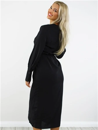 Look sophisticated in this Black Long Sleeve Belted Midi Dress. Featuring long cuffed sleeves, v style wrap over neckline and a gold belt detail. Dress up this midi with perspex heels and jewellery