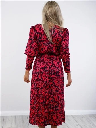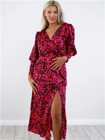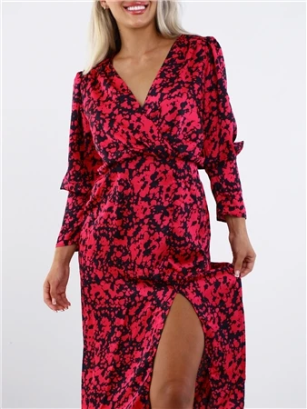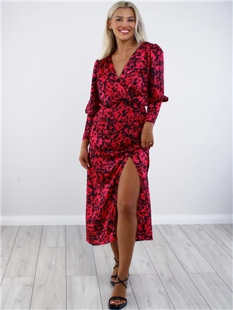 Ax Paris Cerise And Black Printed Split Skirt Midi Dress