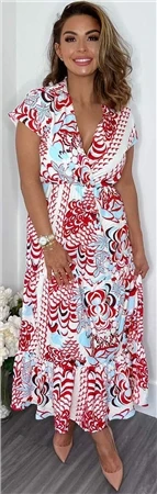 Ax Paris Red Cream And Blue Printed Maxi Smock Dress