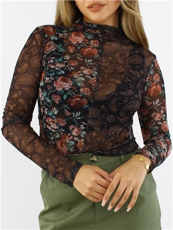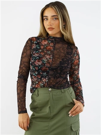Brave Soul Black / Floral Print Mesh Long Sleeve Top