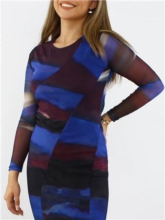 Brave Soul Blue Printed Mesh Long Sleeve Midi Dress