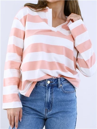 Saint Genies Pink/White Stripe Long Sleeve Collar Top